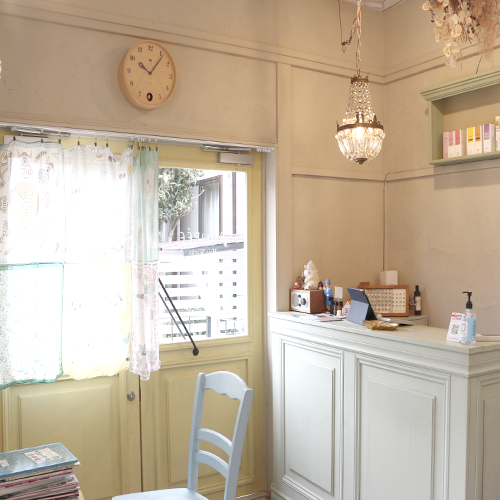 アンティークシャンデリアがサロン内を柔らく灯し、愛らしさと癒しの空間を演出。